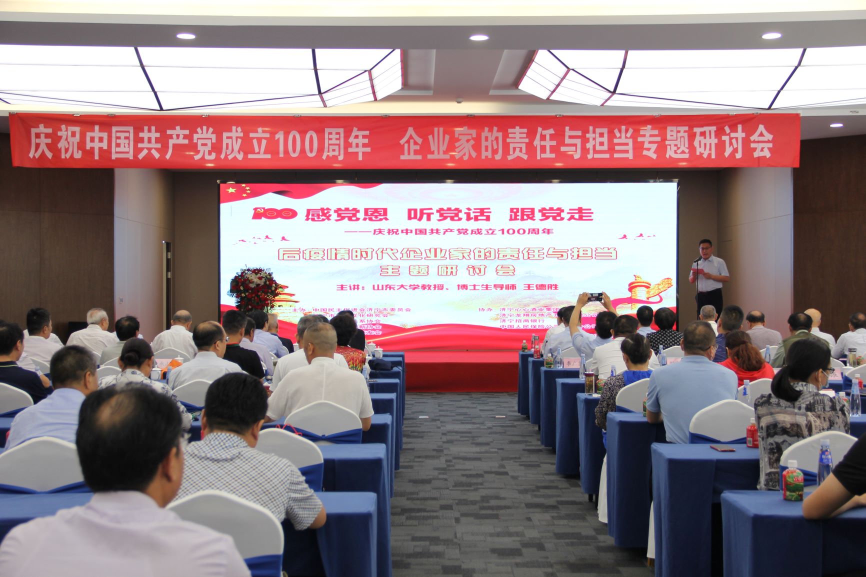 專(zhuān)題研討會(huì)上,濟(jì)寧市國(guó)際國(guó)內(nèi)公共關(guān)系協(xié)會(huì)會(huì)長(zhǎng)、山東大學(xué)濟(jì)寧校友會(huì)理事長(zhǎng)韓宇以《后疫情時(shí)代企業(yè)家的責(zé)任與擔(dān)當(dāng)》為主題進(jìn)行了分享。重點(diǎn)分析了后疫情時(shí)代復(fù)雜多變的國(guó)際國(guó)內(nèi)形勢(shì),剖析我國(guó)的應(yīng)對(duì)策略,強(qiáng)調(diào)了企業(yè)家在經(jīng)濟(jì)發(fā)展中的重要作用,明確了企業(yè)家的責(zé)任與擔(dān)當(dāng)。企業(yè)家在推動(dòng)高質(zhì)量發(fā)展,深化供給側(cè)結(jié)構(gòu)性改革,推動(dòng)改革創(chuàng)新,實(shí)現(xiàn)產(chǎn)業(yè)基礎(chǔ)高級(jí)化、產(chǎn)業(yè)鏈現(xiàn)代化,加快培育完整內(nèi)需體系等方面,肩負(fù)著重要的歷史責(zé)任!弘揚(yáng)企業(yè)家精神,是企業(yè)家實(shí)現(xiàn)責(zé)任和擔(dān)當(dāng)?shù)暮诵呐c強(qiáng)大的動(dòng)力!